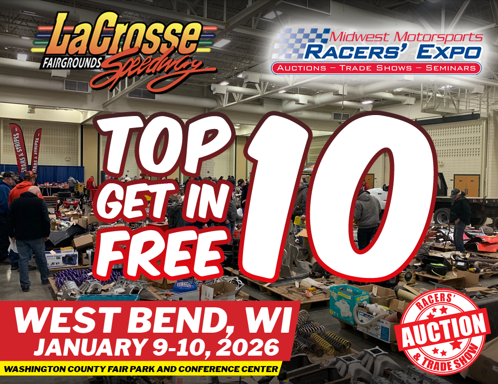 West Salem, WI — LaCrosse Fairgrounds Speedway in conjunction with Midwest Motorsports is proud to announce that all drivers who finished in the Top Ten in points in any LaCrosse Speedway division during the 2025 season will receive FREE admission to the 2026 Midwest Racers’ Auction & Trade Show, held January 9–10, 2026 in West Bend, Wisconsin at the Washington County Fair Park and Conference Center!